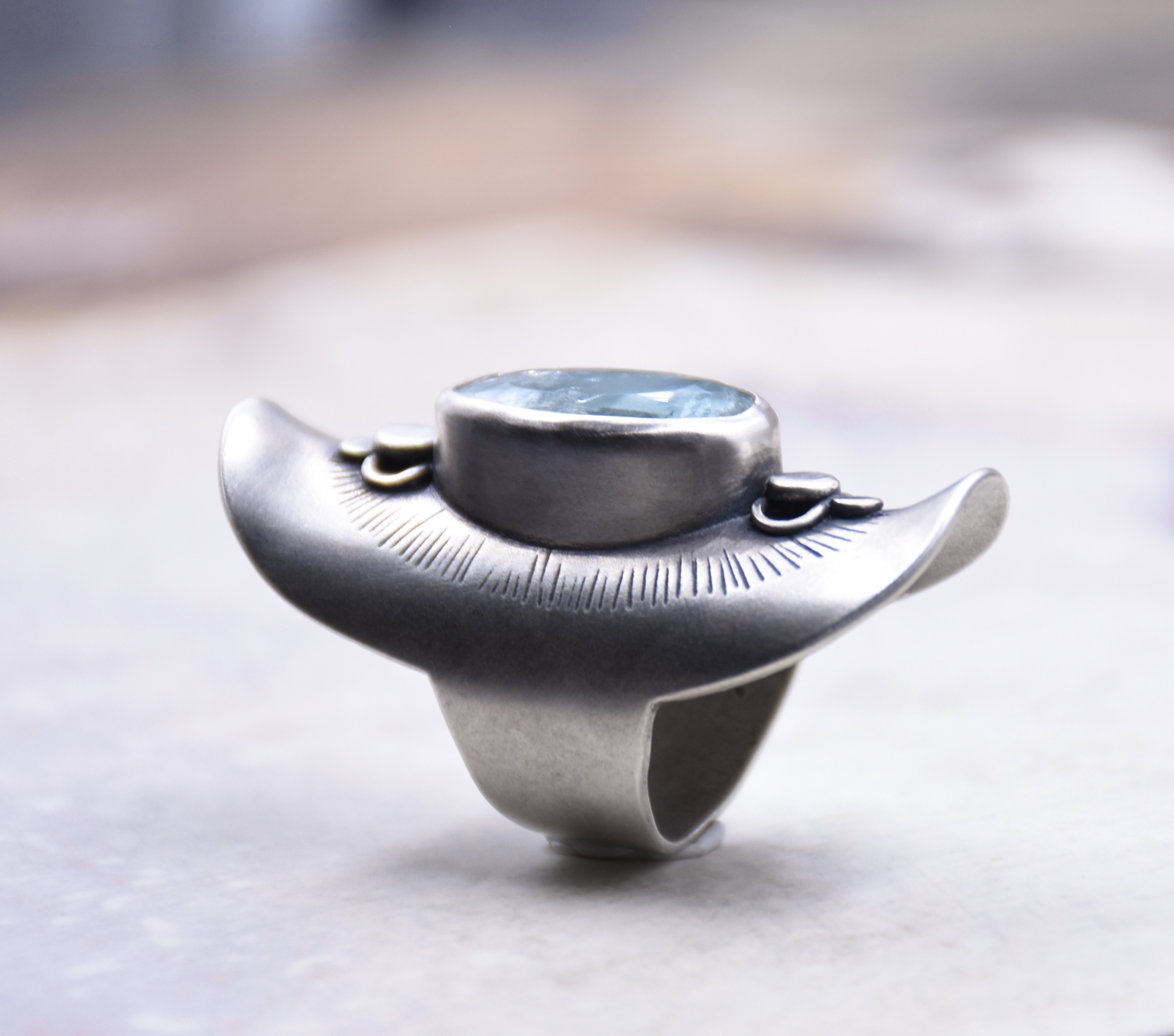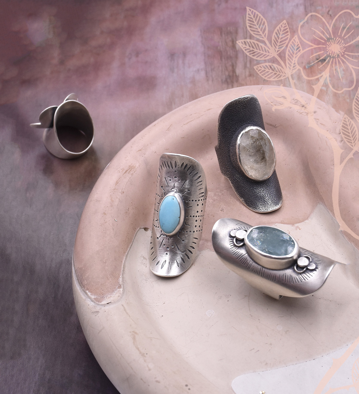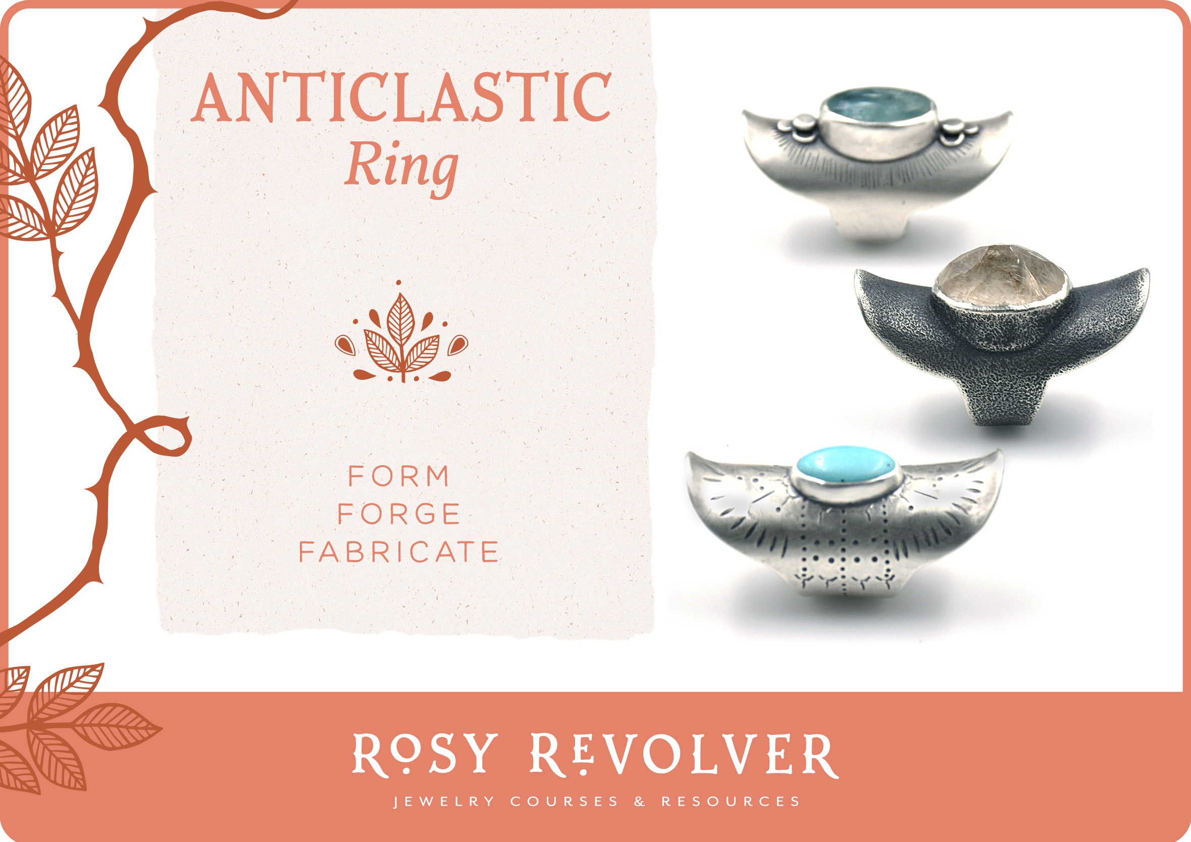 Students can expect an overview of synclastic vs anticlastic forming as it relates to a cigar band style ring. We will discuss template usage and manipulation and walk through the fabrication of heavy gauge sheet to create dimensional, dynamic "saddle ring" silhouettes. Creating hefty sterling bezels and fitting them with precision to the curve of the band are also covered.